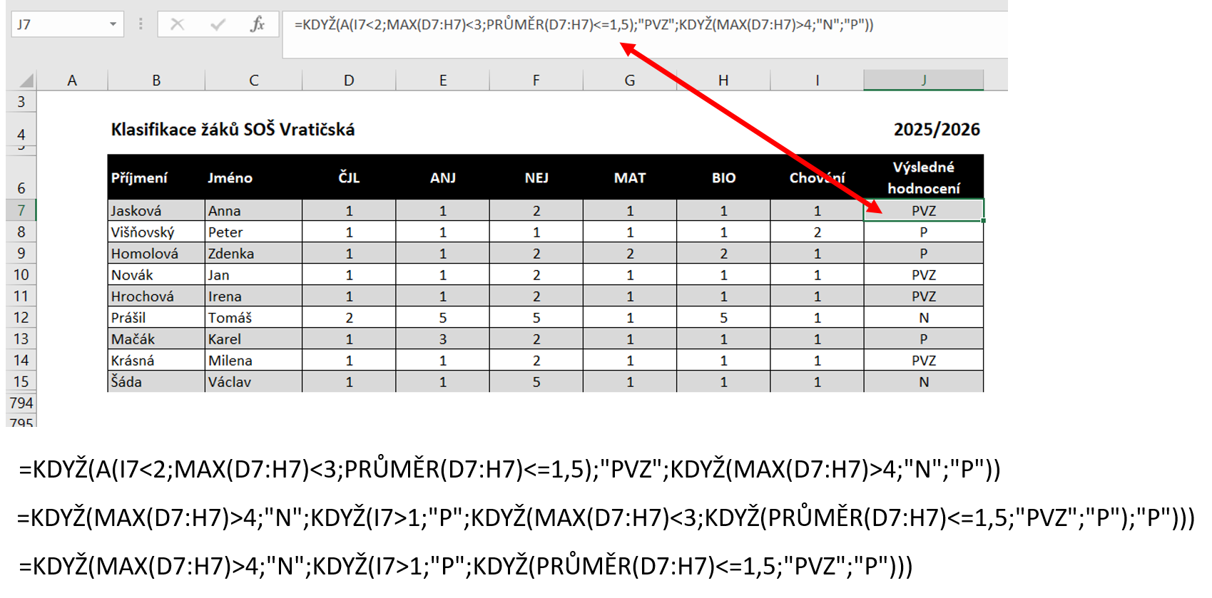 - Klepneme v řádku vzorců do názvu vnější funkce a můžeme pokračovat v zadávání vnější funkce.